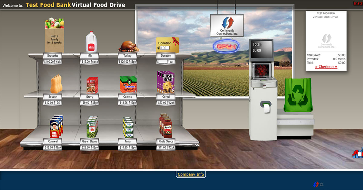 This Virtual Food Drive system is supported on all devices from iPads, iPhones, Android devices all the way to laptops and desktop PCs. Designed to look like a grocery store, donors select "items" from the shelves as if they were buying food to donate. As they scan items, they see the multiplying factor of their dollars translated into meals for the hungry, as well as their savings from buying food themselves.